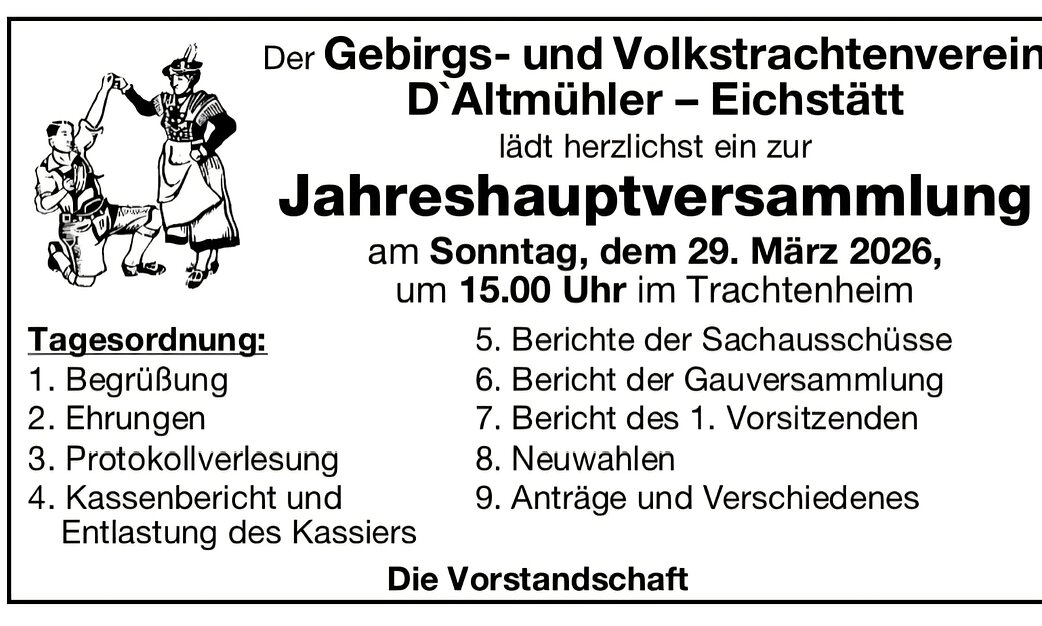 Die Proben starten immer um 19:00 Uhr im Trachtenheim Eichstätt. Unsere Kleinsten proben jeden zweiten und vierten Freitag im Monat von 18:00 bis 19:00 Uhr (Details siehe Termine)