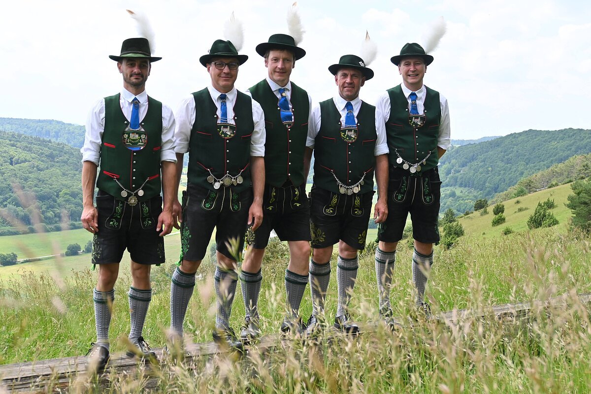 Die Buam tragen eine kurze, schwarze Lederhose, ein weißes Hemd sowie eine blaue Krawatte. Darüber wird eine grüne Weste und ein grauer Janker getragen. Vervollständigt wird die Tracht durch einen grünen Hut mit Adlerflaum, graue Strümpfe sowie schwarze Haferlschuhe.